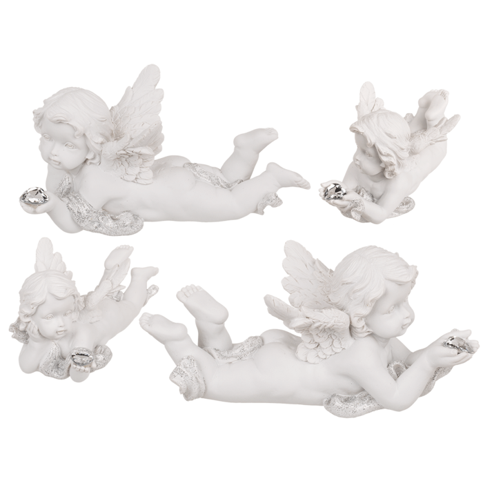 Lying polyresin Angel with crystal heart, ca. 16 x 7 cm, 2 ass.